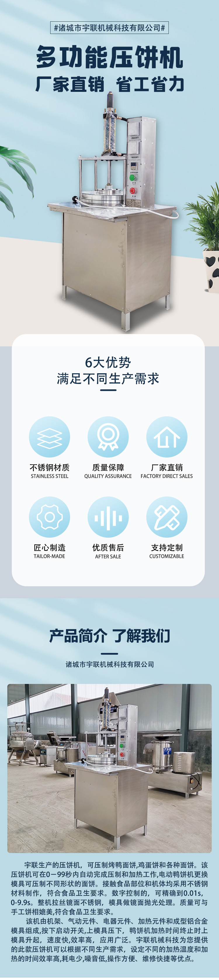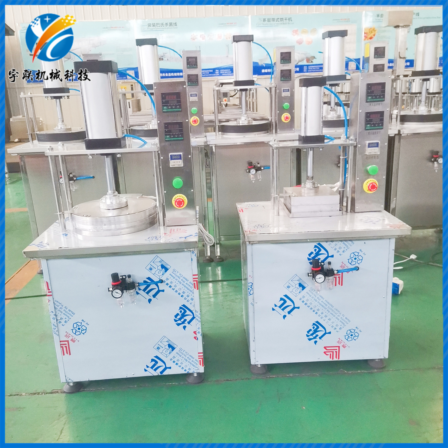 自動壓餅機(jī)(烤鴨餅機(jī)、荷葉餅機(jī)、烙饃機(jī))是將面團(tuán)做成薄餅的機(jī)器,它由機(jī)架、氣動元件、電器元件、加熱元件和成型模具組成,主要用于壓烤鴨面餅、雞蛋餅以及其他品種面餅的使用??筛鶕?jù)需要設(shè)定加熱溫度和加熱時間,能在設(shè)定的時間內(nèi)完成壓制和加熱工作,壓餅機(jī)速度快每小時可做近千張餅(相當(dāng)于人工20人以上)成本低每千張耗電量不足1元錢成型好由機(jī)器做出的烤鴨餅厚薄均勻、光滑圓潤好,操作不需要技術(shù)含量,使用時打開電源開關(guān),設(shè)定加熱時間和加熱溫度,按下啟動開關(guān),壓餅機(jī)模具壓下,設(shè)定時間終了時自動復(fù)位。溫控表顯示上、下加熱溫度,達(dá)到設(shè)定溫度時自動停止加熱,低于設(shè)定溫度時自動通電加熱,達(dá)到設(shè)定的工作溫度時即可進(jìn)行工作將定量的面坯放在模具上,按下啟動開關(guān),上模具壓下,加熱時間終了時上模具升起。速度快,效率高,應(yīng)用廣泛。